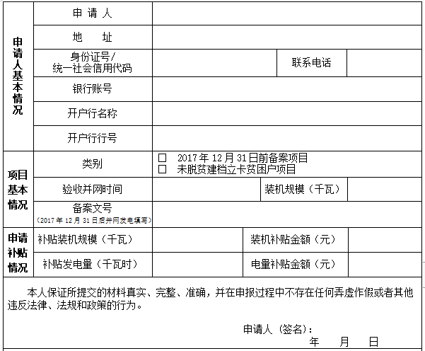 晋城市分布式光伏发电项目补贴资金申请表