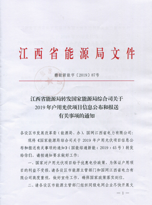 江西省发布2019年户用光伏项目信息公布和报送有关事项的通知