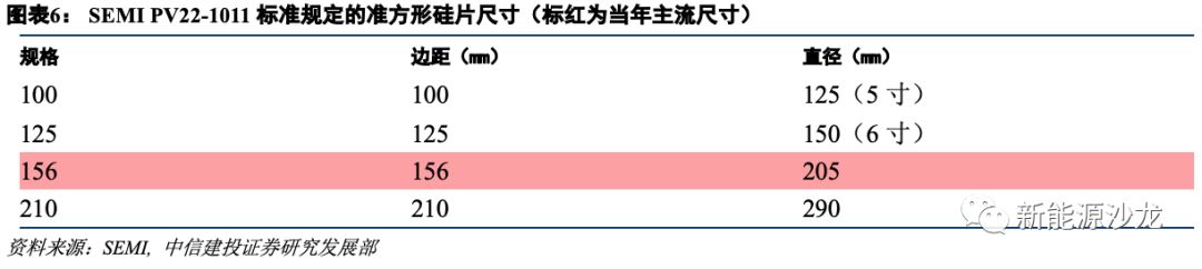 光伏硅片尺寸源自半导体,历史上经历了不断增大的过程 光伏硅片尺寸标准源自半导体硅片,在摊薄成本和提高品质这两大需求的推动下,半导体硅片尺寸不断增大,光伏硅片也随之经历了从小到大的过程。近年来,光伏硅片尺寸经历了三次较大的变革:1)1981至2012之间,硅片边距由100和125大幅增加到156,成本大幅摊薄;2)2013至2017年,硅片规格从M0变革为M1与M2,组件尺寸不变,通过缩小余量、增大电池尺寸来提高功率,从而摊薄成本;3)目前正在进行的变革是硅片规格从M2变革为158.75方单晶和M6大硅片,这次变革增厚了产业链各环节利润空间,并将硅片尺寸推至当前设备的极限。 增大尺寸的驱动力是提高溢价与摊薄成本,M6比158.75有优势 ✔组件售价端,M6可溢价8分,158.75方单晶可溢价2分 ✔组件成本端,M6可摊薄5分,158.75方单晶可摊薄2分 ✔组件超额利润,M6为13分,158.75方单晶的为4分 在电站建设中,使用大硅片高功率组件可以减少支架、汇流箱、电缆等成本,从而摊薄系统单瓦成本,为组件带来溢价;在制造成本端,大硅片本身可以摊薄硅片、电池、组件生产环节的非硅成本,从而直接增厚各环节利润。总的来看,158.75方单晶组件的超额利润为4分钱,M6超额利润为13分钱,M6的空间更大。在目前的价格水平下,158.75方单晶所获超额利润基本留在了硅片环节,而M6大部分超额利润流向了组件环节。推广M6硅片的原动力在于增厚产业链各环节利润。在定价方面,我们认为M6定价紧跟M2即可始终保持竞争优势,使得各环节的摊薄成本沉淀为本环节的利润,从而使各环节毛利率均有提高。 M6已达部分设备允许的极限,短时间内硅片尺寸标准难再提高 增大硅片尺寸的限制在于现有设备的兼容性。通过梳理拉棒切片、电池、组件三个环节用到的主要生产设备,我们发现现有主流设备可以兼容M6硅片,但这一规格已基本达到现有设备允许的尺寸上限,继续增大硅片尺寸则需重新购置部分设备,使得增大尺寸带来的成本下降被新购设备带来的成本上升所抵消。因而短时间内硅片尺寸标准难以再提高,M6将在相当长的一段时间内成为标准上限。 推荐标的:首推M6大硅片龙头企业隆基股份,其次推荐关注电池龙头以及爱旭太阳能(ST新梅),另外组件环节关注东方日升,设备环节关注捷佳伟创与迈为股份。 风险提示: 1)大硅片推广进度不及预期; 2)全球光伏需求不及预期; 3)产业链价格下跌超预期。 目录 投资要点 近期,硅片尺寸之争再起,硅片龙头隆基股份推出M6大硅片产品,并同时发布大硅片组件Hi-MO4,清楚表明了力推M6的意愿。那么历史上硅片尺寸经历过怎样的变化过程?隆基为何要力推M6?与另一尺寸路线158.75方单晶相比,M6有何优势,二者谁将胜出?M6之后,是否会有更大尺寸的硅片产品推出?本报告试图解答这些问题。 光伏硅片尺寸源自半导体,经历了从125到156,从M0到M2这一不断增大的过程。 光伏硅片尺寸标准源自半导体硅片,在摊薄成本和提高品质这两大需求的推动下,半导体硅片尺寸不断增大,光伏硅片也随之经历了从小到大的过程。近年来,光伏硅片尺寸经历了3次较大的变革:1)1981至2012之间,硅片边距由100和125大幅度增大为156,成本大幅摊薄;2)2013至2017年,硅片规格从M0(边距156,直径200)变革为M1(边距156.75,直径205)与M2(边距156.75,直径210),组件尺寸不变,硅片尺寸增大,从而摊薄成本;3)目前正在进行中的变革是硅片规格从M2变革为158.75方单晶或者M6大硅片,这次变革增厚了产业链各环节利润空间,并将硅片尺寸推至当前设备允许的极限。 增大硅片尺寸的驱动力是提高溢价、摊薄成本、拓展利润空间,在这些方面上M6比158.75方单晶更有优势。在电站建设中,使用大硅片高功率组件可以减少支架、汇流箱、电缆等成本,从而摊薄单瓦系统成本,为组件带来溢价;在组件售价端,158.75方单晶可溢价2分钱,M6可溢价8分钱。在制造成本端,大硅片本身可以摊薄硅片、电池、组件生产环节的非硅成本,从而直接增厚各环节利润;在硅片、电池、组件总成本方面:158.75方单晶可降低2分钱,M6可降低5分钱。因而,总的来看,158.75方单晶的超额利润为4分钱,M6超额利润为13分钱,M6的空间更大。在目前的价格水平下,158.75方单晶所获超额利润基本留在了硅片环节,而M6大部分超额利润流向了组件环节。推广M6硅片的原动力在于增厚产业链各环节利润。在定价方面,我们认为M6定价紧跟M2即可始终保持竞争优势,使得各环节的摊薄成本内化为本环节的利润,从而使各环节毛利率均有提高。 M6已达部分设备允许尺寸的极限,短时间内硅片尺寸标准难以再提高。增大硅片尺寸的限制在于现有设备的兼容性。通过梳理拉棒切片、电池、组件三个环节用到的主要生产设备,我们发现现有主流设备可以兼容M6硅片,但这一规格已基本达到现有设备允许的尺寸上限,继续增大硅片尺寸则需重新购置部分设备,使得增大尺寸带来的成本下降被新购设备带来的成本上升所抵消。因而短时间内硅片尺寸标准难以再提高,M6将在相当长的一段时间内成为标准上限。 硅片尺寸变革史:从125到156,从M0到M2 硅片形状分类:方形和准方形 从形状来看,硅片可以分为方形硅片和准方形硅片两大类。方型硅片并非完全正方,而是在四角处也有小倒角存在,倒角长度B一般为2 mm左右。准方形硅片四角处为圆倒角,尺寸一般比方型硅片的倒角大很多,在外观上比较明显。 硅片的关键尺寸:边距 对方
