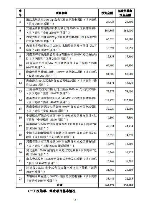 根据公告内容,东旭蓝天共募集资金超95亿元,用于投资建设规模为989.96MW,共计23个电站项目。