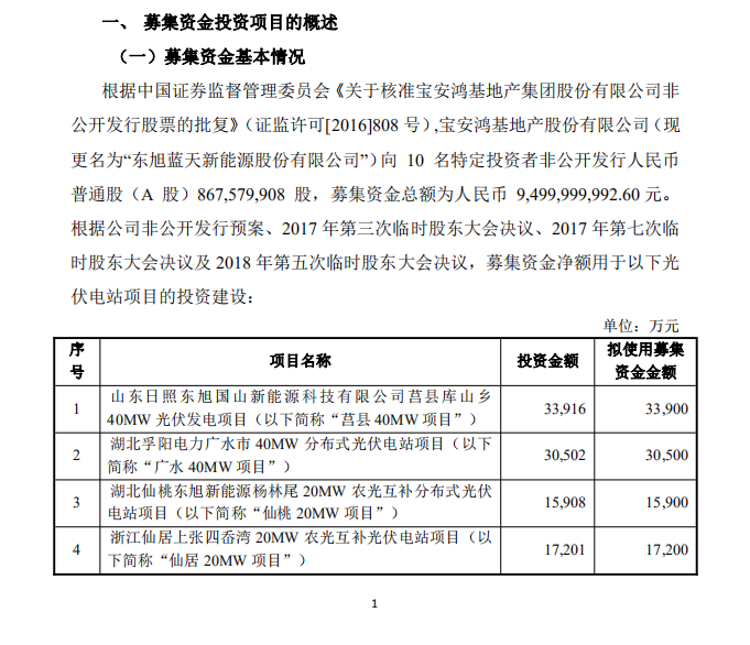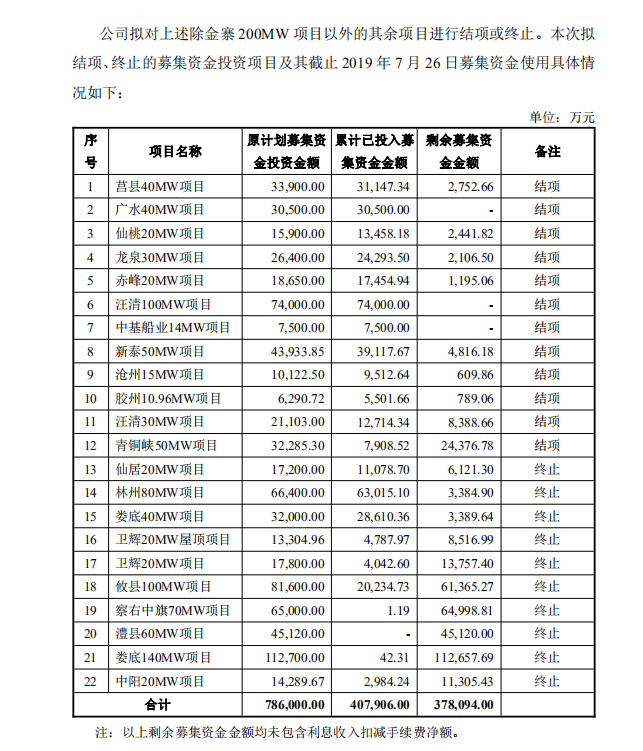 东旭蓝天表示,只保留其中金寨200MW电站项目,其余投建项目均进行结项或终止。截至7月26日,本次拟结项、终止的募集资金投资项目募集资金使用具体情况如下:
