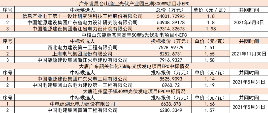 在中标价格方面,大EPC报价最低的项目为保定200MW平价项目,由中能建安徽电力建设集团投出3.35元/瓦,小EPC报价最低的项目为大唐广东韶关仁化75MWp光伏发电项目,由中能建广东火电建设集团投出1.14元/瓦。具体中标情况见下: