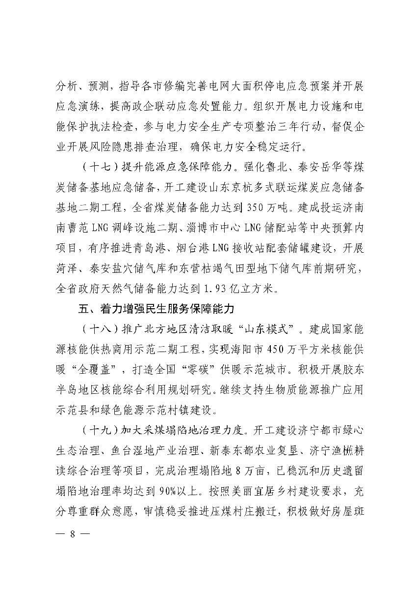 文件指出,加快推进能源结构优化调整,实施可再生能源倍增计划,围绕打造千万千瓦级盐碱滩涂地风光储一体化基地,建成投运通威东营渔光一体化生态园区等项目;推进采煤沉陷区光伏基地建设,建成新泰翟镇采煤塌陷地平价光伏等项目;支持利用厂房、商业建筑屋顶等,建设分布式光伏电站。可再生能源发电装机突破5000万千瓦,年内完成投资300亿元以上。