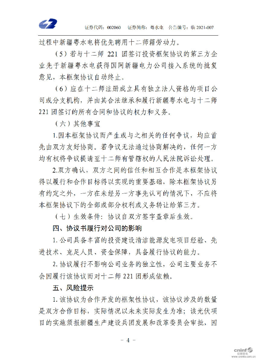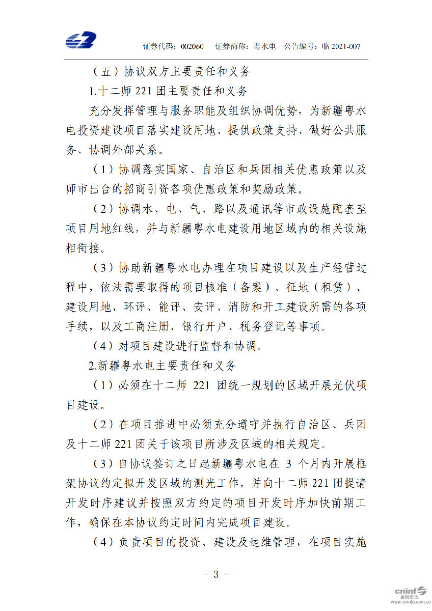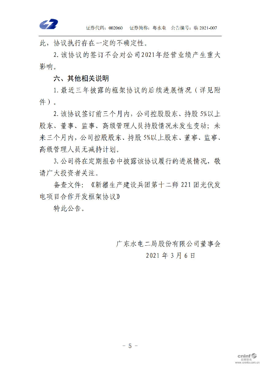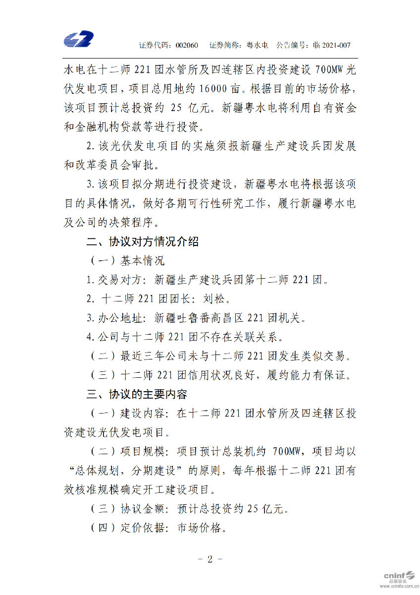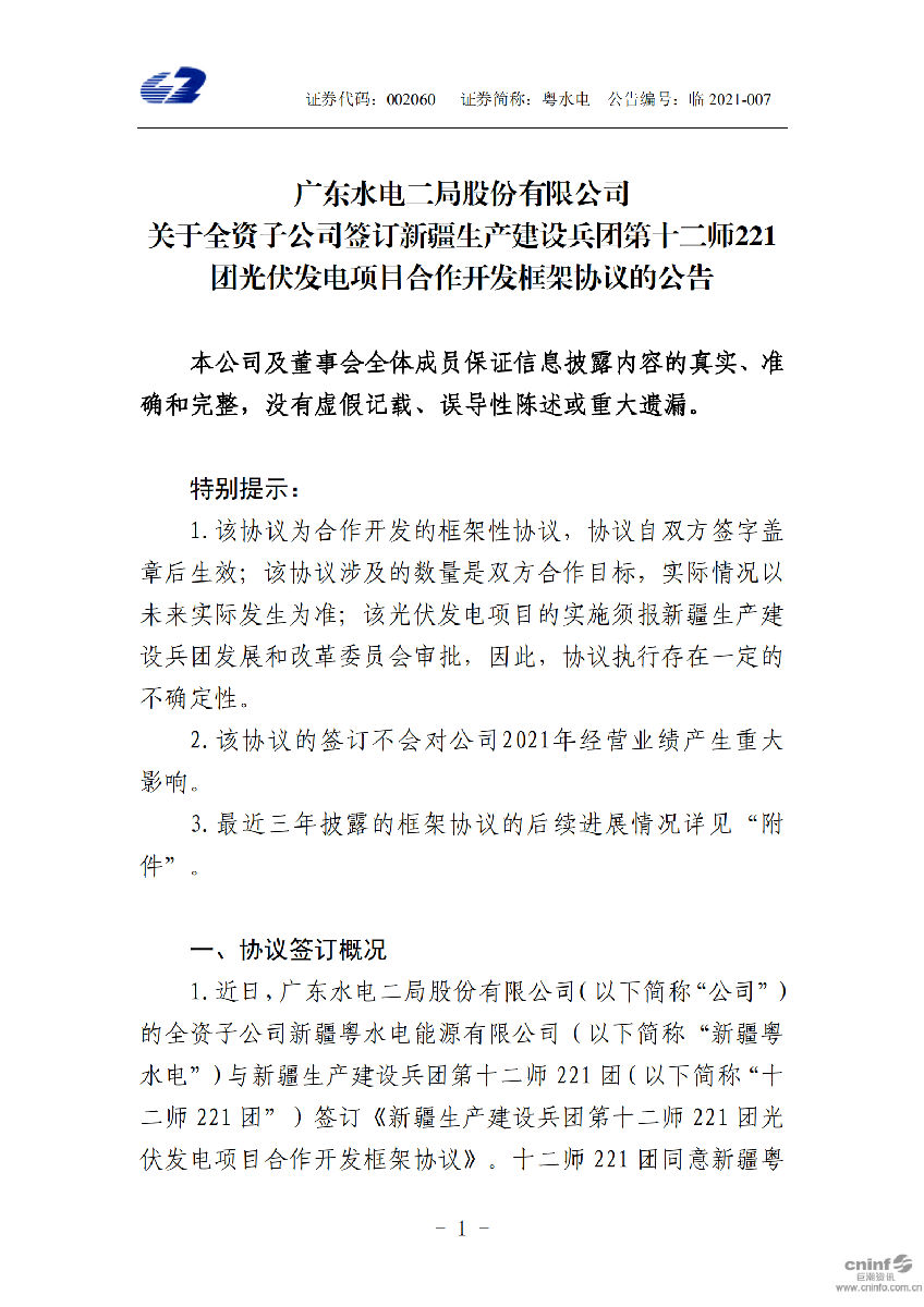近日,广东水电二局股份有限公司的全资子公司新疆粤水电能源有限公司与新疆生产建设兵团第十二师221团签订《新疆生产建设兵团第十二师221团光伏发电项目合作开发框架协议》。