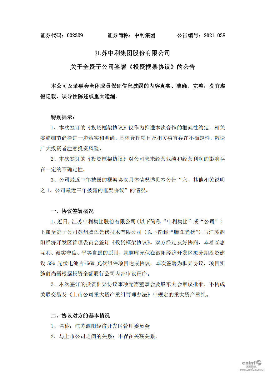 3 月 11日中利集团发布公告,近日,公司下属全资子公司苏州腾晖光伏技术有限公司(“腾晖光伏”)与江苏泗阳经济开发区管理委员会签订《投资框架协议》。双方经过友好协商,本着互惠互利、诚实守信、平等自愿的原则,就腾晖光伏在泗阳经济开发区拟分期投资建设5GW光伏电池片+5GW光伏组件项目达成协议。本次签署为框架协议,项目实施前尚需根据投资金额履行公司内部审议程序。