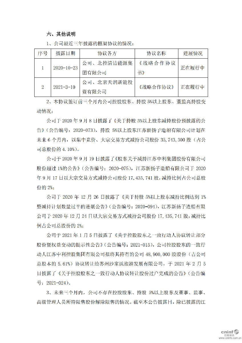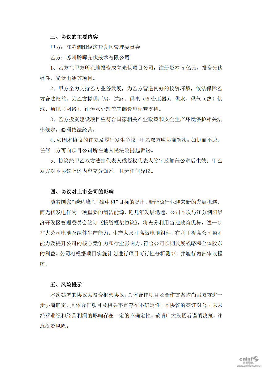 随着国家“碳达峰”、“碳中和”目标的提出,新能源行业迎来新的发展机遇,而光伏发电作为一项重要的清洁能源,近几年发展迅速,公司此次与江苏泗阳经济开发区管理委员会签订《投资框架协议》,将充分利用当地政策优势,进一步扩大公司电池及组件生产能力,生产大尺寸高效电池组件,有利于提高公司盈利能力及提升公司的核心竞争力和行业影响力,符合公司长期发展战略和全体股东的利益。公司将根据项目实施计划进行项目可行性分析测算,并履行内部审议程序。