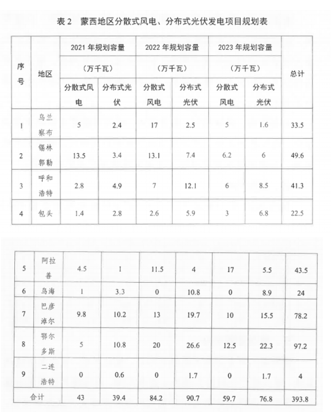 近日,内蒙古自治区能源局印发《内蒙古自治区分散式风电、分布式光伏发电项目三年行动计划(2021~2023年)》的通知,2021年~2023年规划2.395GW分布式光伏,蒙西电网区域206.9万千瓦,蒙东电网区域32.6万千瓦。