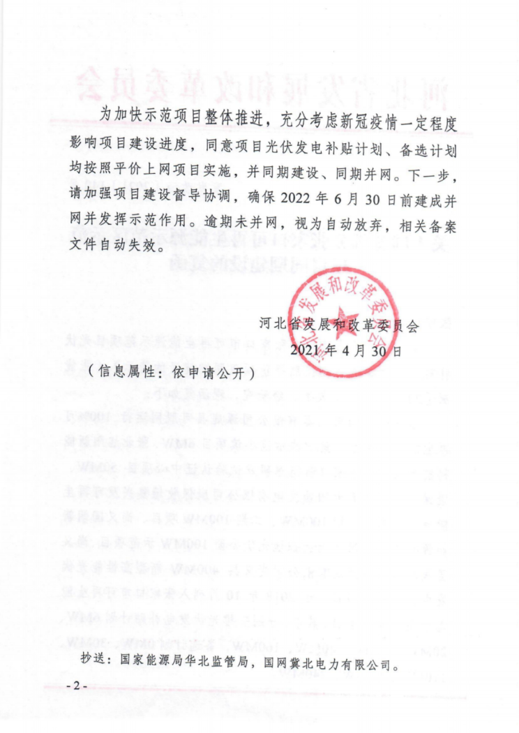 今年4月底,河北省发改委下发《关于同意部分张家口可再生能源示范区示范项目同期建设的复函》,同意该示范区内5个光伏示范项目总计756MW可延期至2022年6月30日前并网,执行平价上网电价。