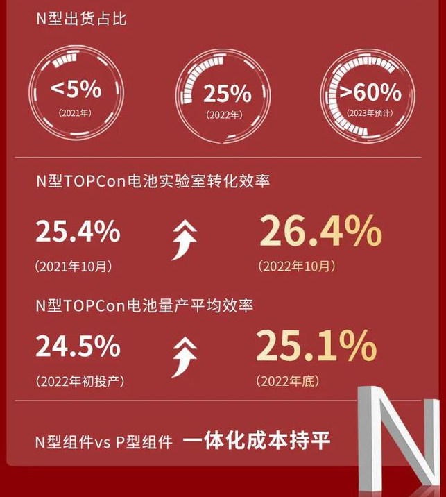 目前,公司已投产N型产能35GW,已实现N型组件与P型组件一体化成本持平,N型TOPCon电池量产平均效率已达25.1%。展望2023年,目前N型市场需求旺盛,预计N型组件将成为出货主力,晶科能源预期N型产品出货占比从2022年的25%进一步提升至60%以上。