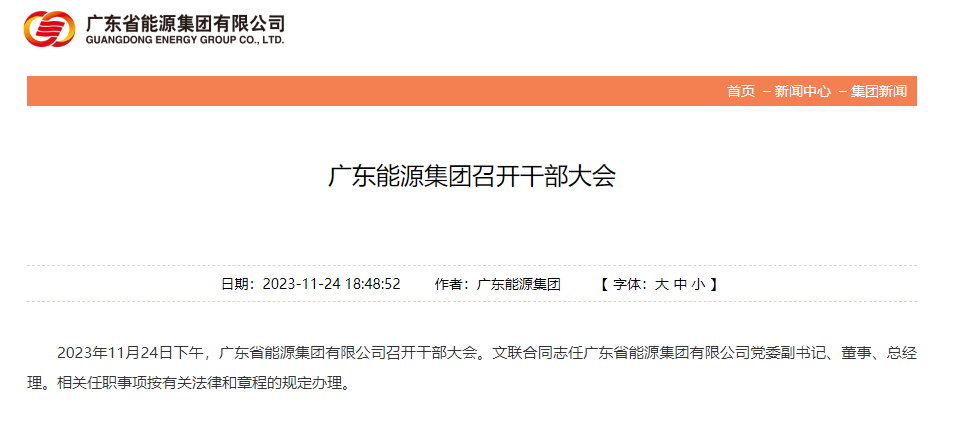 广东省能源集团有限公司 11月24日下午,广东省能源集团有限公司召开干部大会。文联合同志任广东省能源集团有限公司党委副书记、董事、总经理。相关任职事项按有关法律和章程的规定办理。 广东省能源集团有限公司成立于2001年8月8日,其前身广东省粤电资产经营有限公司是全国第一家因“厂网分开”电力体制改革而组建的发电企业,2003年更名为广东省粤电集团有限公司。2019年2月18日,正式更名为广东省能源集团有限公司。公司注册资本230亿元人民币,由广东省政府和华能集团分别持有76%和24%股权。公司核心产业涉及火电、水电、风电、太阳能发电、生物质发电、核电、天然气等,上下游产业涉及煤矿、航运、港口、金融业、综合能源服务等,遍布广东全境并延伸至省外和海外,已形成以能源产业为核心、上下游产业链协同发展的产业格局。 广西能源股份有限公司 近日,广西能源股份有限公司发布公告称,选举姚若军为公司董事长;同意聘任黄维俭为公司总裁。