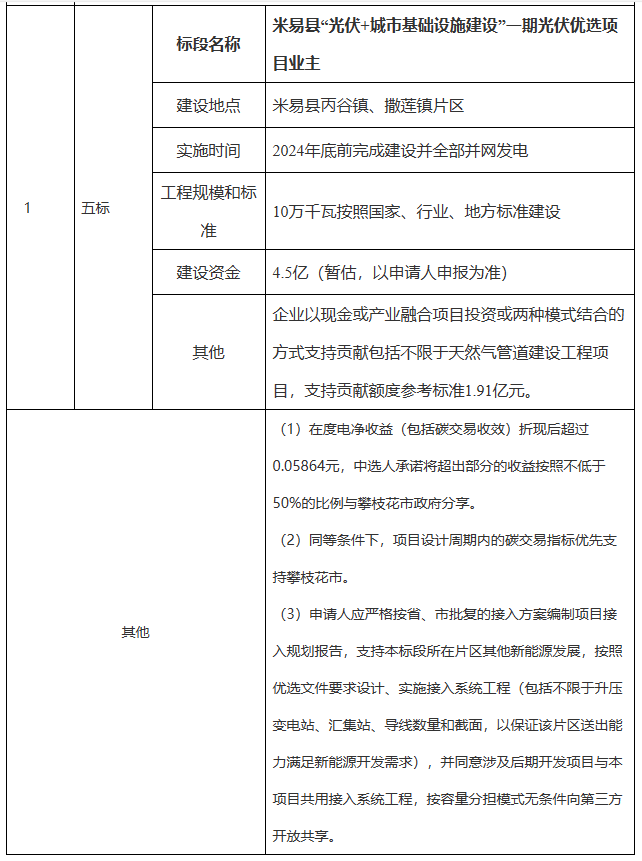 本次项目招标的额外要求为企业以现金或产业融合项目投资或两种模式结合的方式支持贡献包括不限于天然气管道建设工程项目,支持贡献额度参考标准1.91亿元。此外,在度电净收益(包括碳交易收效)折现后超过0.05864元,中选人承诺将超出部分的收益按照不低于50%的比例与攀枝花市政府分享。同等条件下,项目设计周期内的碳交易指标优先支持攀枝花市。