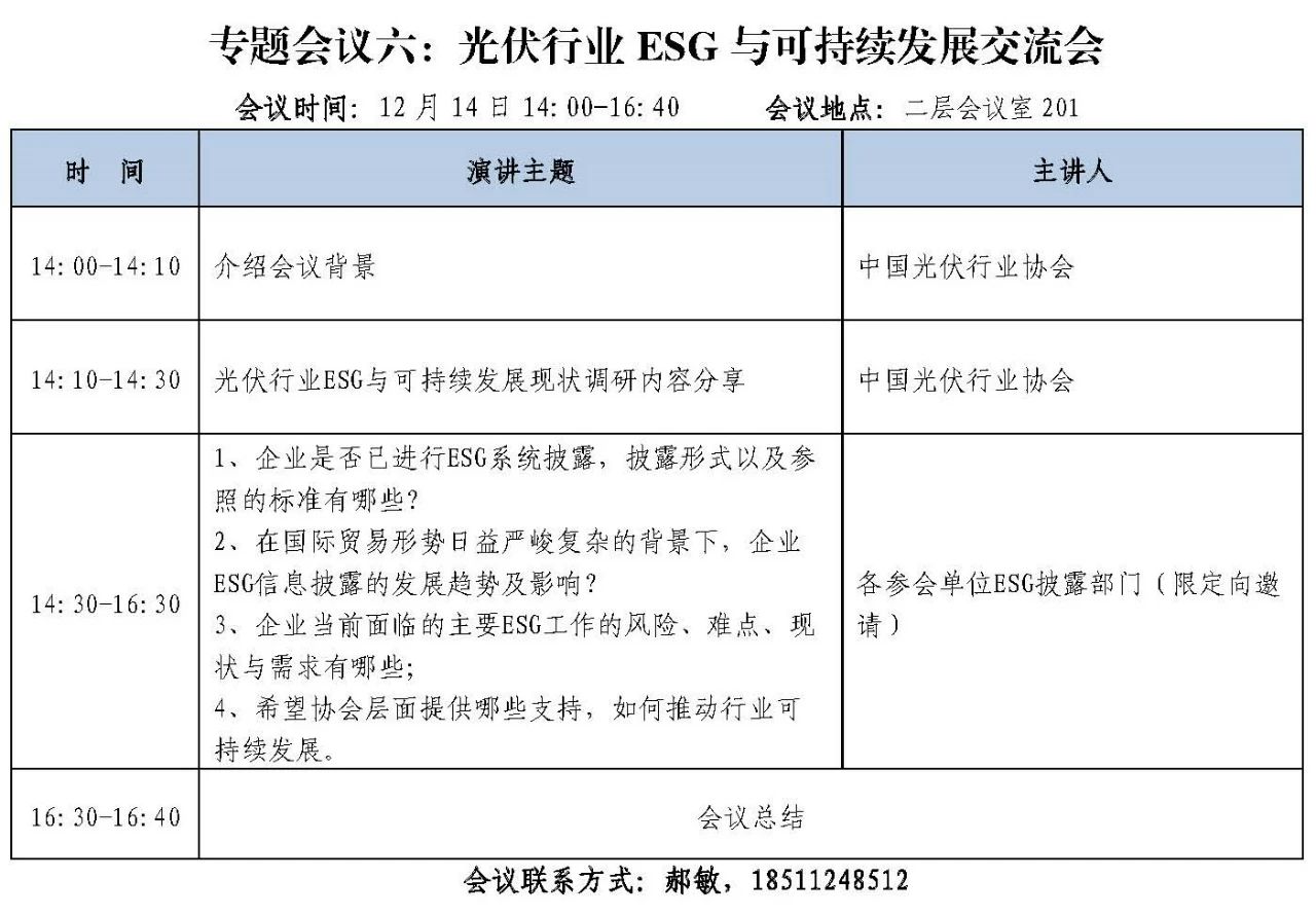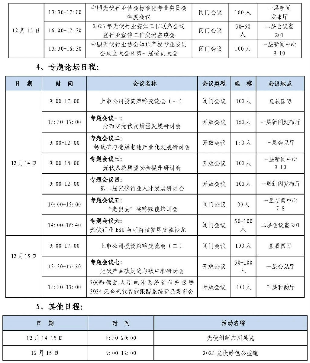 为更好探讨新形势下全球和光伏市场发展情况、发展方向与路径,促进行业交流与沟通,中国光伏行业协会将于2023年12月14-16日在江苏省宿迁市召开“2023光伏行业年度大会”,邀请行业主管部门、行业组织、行业专家、光伏企业领袖等代表一起就行业发展热点问题进行探讨分析。大会同期还将召开光伏供应链配套发展论坛、光伏应用生态创新发展论坛及各项专题论坛等活动。现就有关事项通知如下: 一、会议主题 融合创新 迎变突破 二、会议内容 (一)宏观形势分析:我国电力系统清洁转型发展路径、光伏行业发展机遇与挑战分析等; (二)光伏企业领袖对话:围绕新型电力系统以及能耗双控背景下光伏行业发展的机遇与挑战展开对话讨论; (三)行业专家主题报告:聚焦光伏供应链各环节、应用端发展情况与分布式光伏、钙钛矿与叠层电池等展开主题分析。 三、会议组织架构 主办单位: 中国光伏行业协会 宿迁市人民政府 承办单位: 宿迁经济技术开发区管委会 天合光能股份有限公司 四、会议时间与地点 会议时间:2023年12月14-16日 会议地点:江苏省宿迁市星辰国际酒店(江苏省宿迁市湖滨新城玉兰路5号) 五、参会人员 来自政府主管部门、行业组织、行业专家、研究机构、光伏企业、金融机构等代表,预计规模1200人。 六、参会要求 (一)参会费用:会员单位免费参会并提供午餐券,会员单位限定2人,理事及以上单位限定3人;非会员单位1人免费参会但不提供午餐。以上超出人员每场按照2000元/人收取参会会费(受邀单位除外)。同时,为答谢行业同仁对协会工作的支持,中国光伏行业协会将于12月14日晚18:30—20:30在同一会场举办年会晚宴,会员单位限1人,理事以上单位限2人,凭券入场,仅限会员单位及受邀嘉宾参加。 参会人员交通及住宿费用自理,如需预定房间可与酒店方联系,报中国光伏行业协会可享受协议价(会议酒店相关信息详见附件2)。 (二)会议报名及签到:请于2023年12月8日(星期五)下午17:00前扫描以下二维码进行报名。会议不接受未提前报名人员参会,会务组严格按照报名信息提供相应资料、餐券等,如参会人员变化,请及时与协会秘书处联系。因参会单位较多,参会名额有限,请各单位从速报名。 (三)收费参会人员请于会前将费用汇至如下协会账户,并于会议当天签到时向工作人员索取发票(协会默认开具发票内容为会议服务)。 户名:中国光伏行业协会 账号:11001042400053008480 开户行:中国建设银行股份有限公司北京万丰支行 七、会务组联系方式 联系人:张腾仁/王媛媛/宋泽华 电话:010-68207670/7623/0067 邮箱:huiyuanbu@chinapv.org.cn