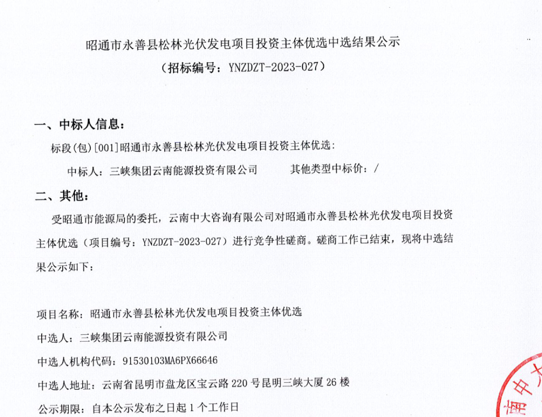 1月9日,云南省昭通市能源局公示6个光伏发电项目,合计1.055GW投资主体优选中标结果。其中,中电建新能源集团股份有限公司、三峡集团云南能源投资有限公司、中城投集团新能源有限责任公司、大唐云南发电有限公司分别中标4个光伏项目投资主体,总规模84万千瓦;2个项目(合计215MW)因报名人数不足三家流标。