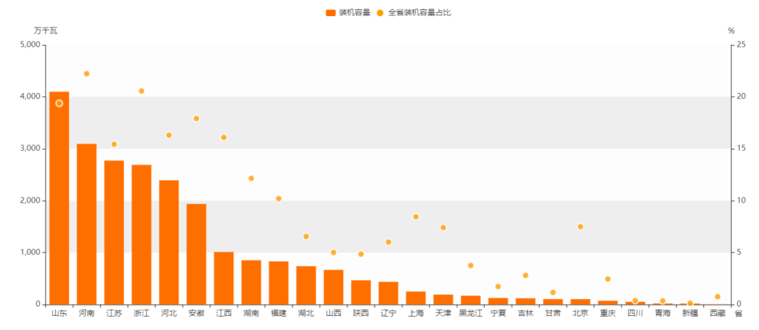 从分布式累计装机来看,山东达到40GW级,河南达到30WG级,江苏、浙江、河北等省则达到20GW级。
