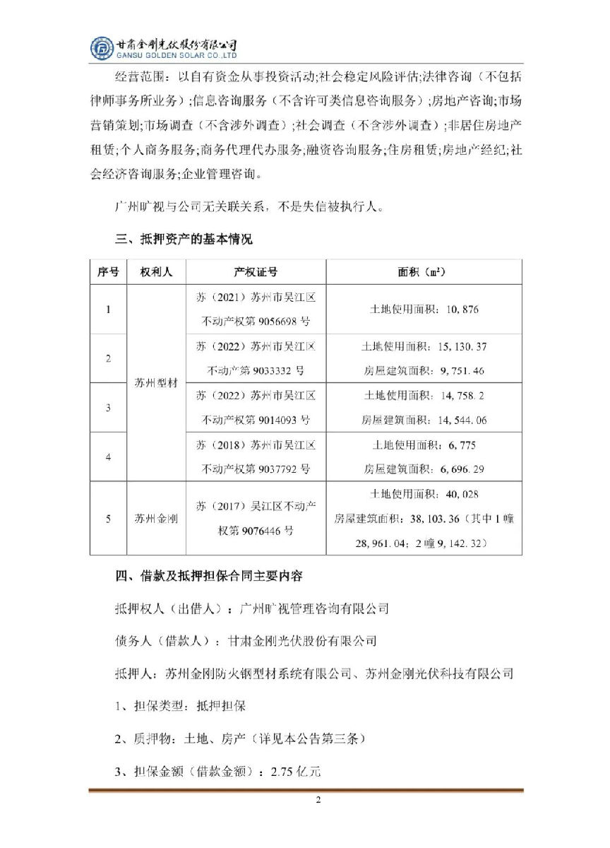 公告显示,金刚光伏拟与广州旷视管理咨询有限公司(以下简称 “广州旷视”)签署《借款合同》及《最高额抵押合同》,广州旷视向公司提供 2.75 亿元的借款,公司子公司苏州金刚防火钢型材系统有限公司(以下简称“苏州型材”)及苏州金刚光伏科技有限公司(以下简称“苏州金刚”)以其部分土地、房产为前述借款提供抵押担保,土地使用面积加房屋建筑面积共156662.74平方米。其中,借款利率为11.5%,借款期限从议案通过之日起计算,即2024年3月1日至2025年3月1日。