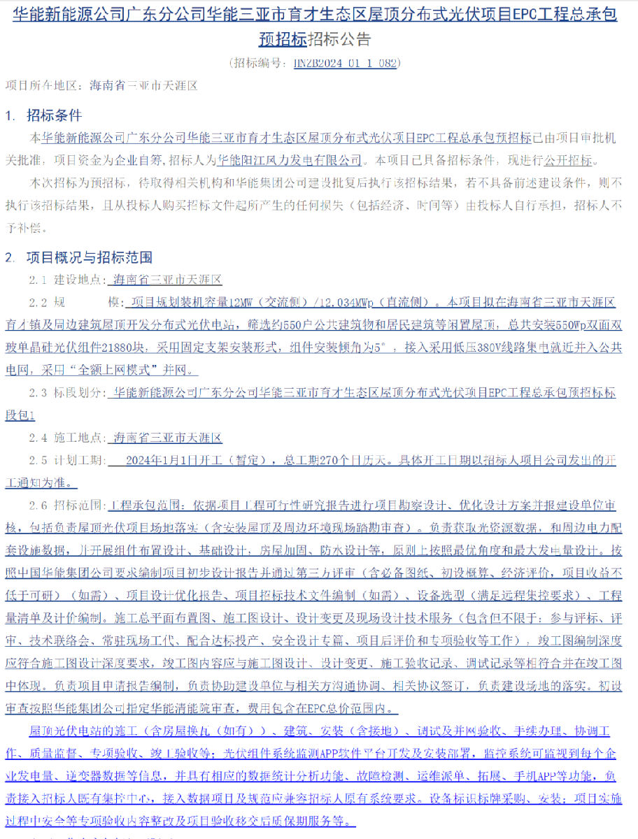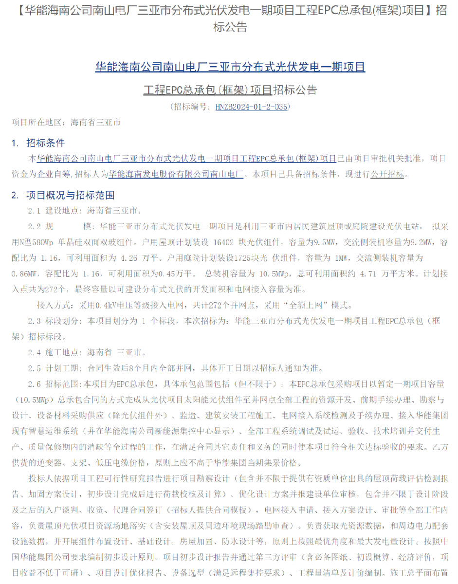 根据招标公告,华能海南公司南山电厂三亚市分布式光伏发电一期项目工程EPC总承包(框架)项目招标范围包括(但不限于):本EPC总承包采购项目以暂定一期项目容量(10.5MWp)总承包合同的方式完成从光伏项目太阳能光伏组件至并网点全部工程的资源开发、前期手续办理、勘察与设计、设备材料采购供应(除光伏组件外)、监造、建筑安装工程施工、电网接入系统检测及手续办理、接入华能集团现有智慧运维系统(并在华能海南公司新能源集控中心显示)、全部工程系统调试及试运、验收、技术培训并交付生产、质量保修期内的消缺等全过程的工作,在满足合同其它责任和义务的同时使本项目符合相关达标验收的要求。乙方供货的逆变器、支架、低压电缆价格,原则上应不高于华能集团当期集采价格。