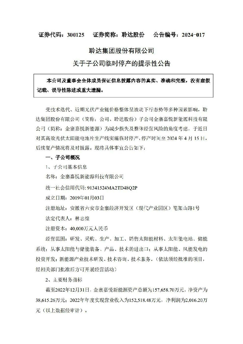 3月15日,聆达股份发布公告,受技术迭代、近期光伏产业链价格整体呈波动下行态势等多种因素影响,公司子公司金寨嘉悦新能源科技有限公司为减少损失及整体经营风险的角度考虑,于近日对其高效光伏太阳能电池片生产线实施临时停产,停产时间至2024年4月15日,后续复产情况将及时披露。