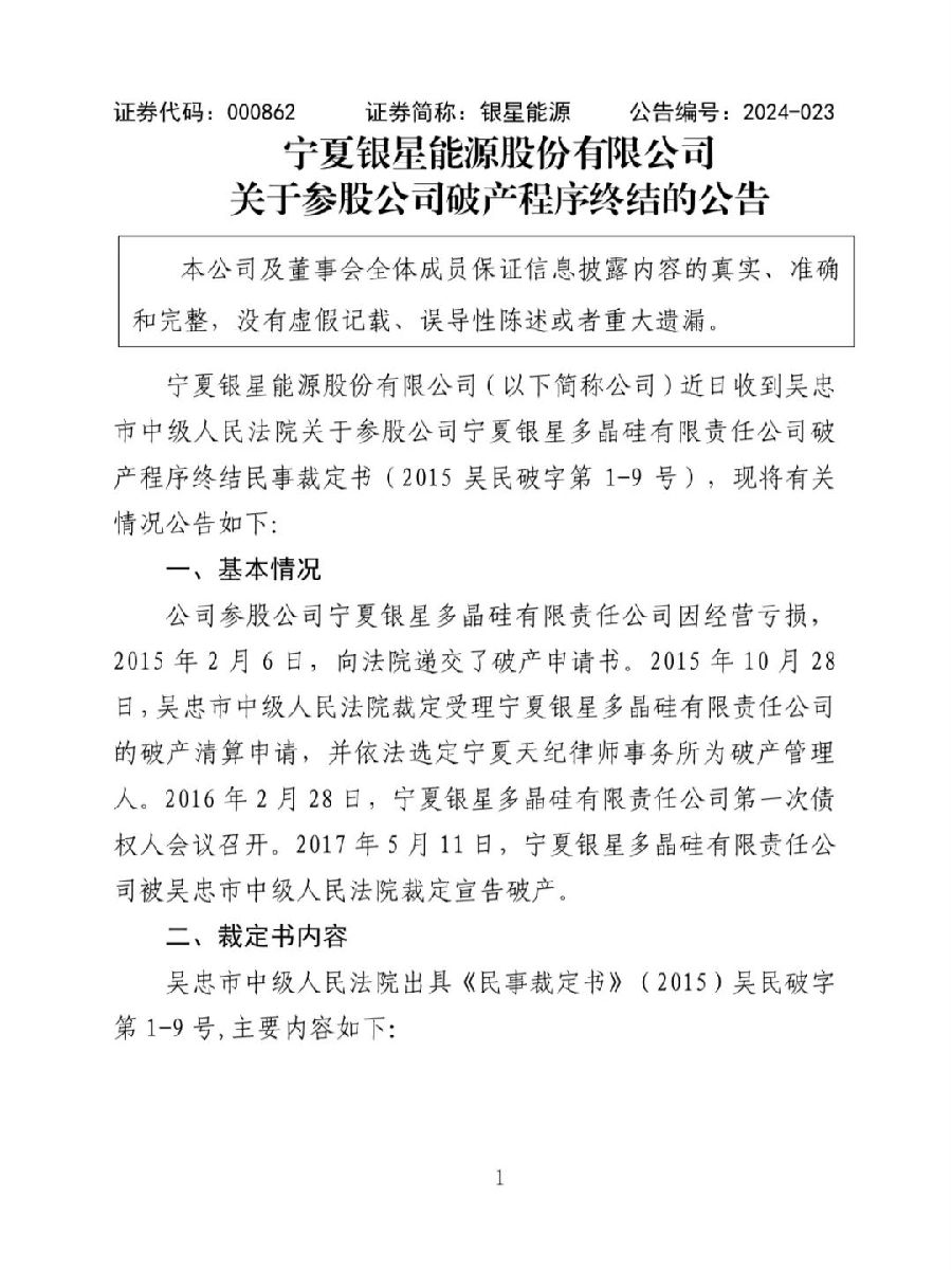 3月26日,宁夏银星能源股份有限公司发布关于参股公司——宁夏银星多晶硅有限责任公司破产程序终结的公告。