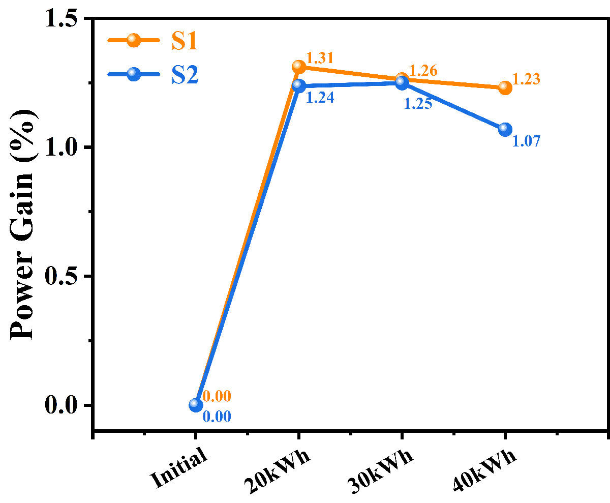 在光照累计20kWh以及Imp注入48h时,HJT组件出现了明显的功率增加并达到峰值。