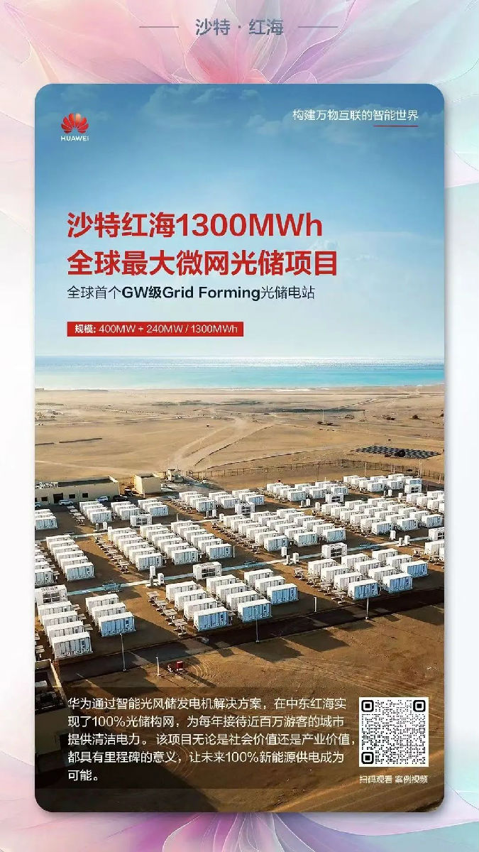 在沙特红海,华为助力客户打造了全球最大的光储微网项目“沙特红海400MW光伏和1.3GWh储能”,成功实现独立稳定构网,为红海新城百万游客提供100%新能源绿色供电;在西藏阿里,华为联合西藏开发投资集团部署组串式构网型储能系统,打造了全球首个超高海拔、超低温、超弱电网环境下构网型储能的创新示范,为极端环境新能源并网提供可复制的技术路径和实证经验;青海格尔木绿发多能互补新能源电站储能项目,成功验证了华为智能光风储发电机构网型储能性能及与各类电源协同运行、多机并联的能力。
