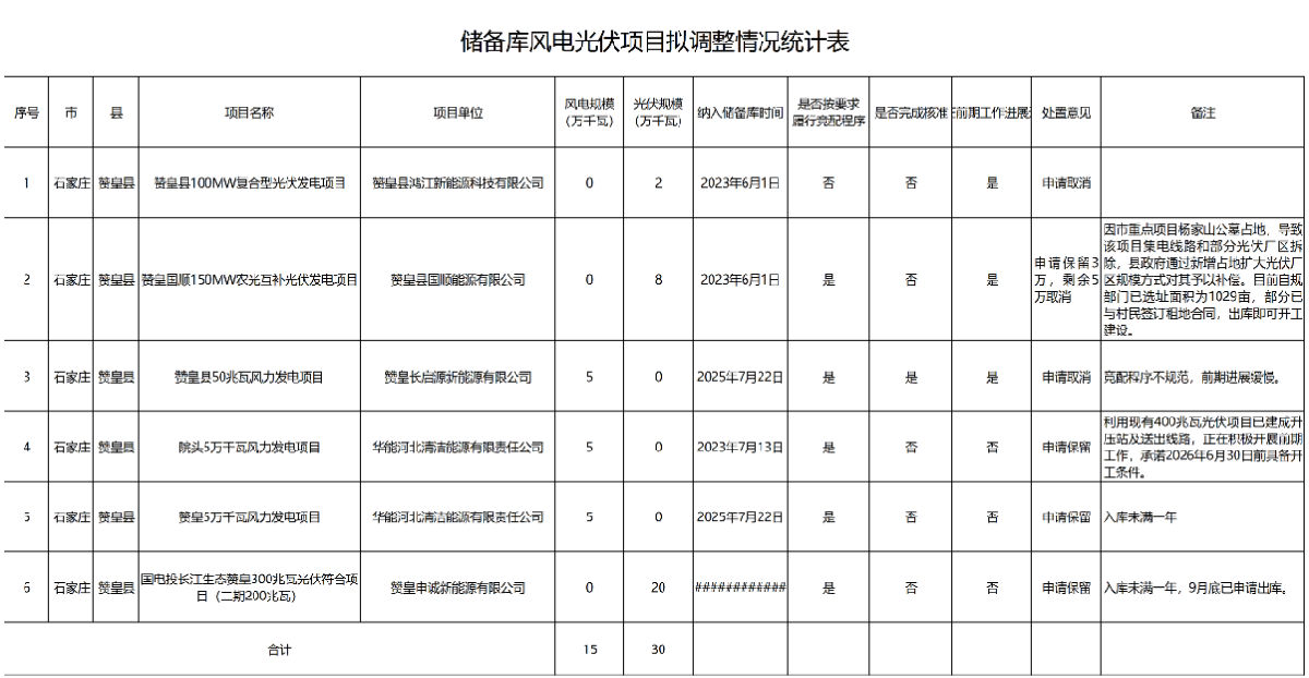 2025年12月底,河北赞皇县到期和储备库风电光伏项目拟调整项目共7个,规模合计495MW,包含风电项目195MW,光伏项目300MW。其中国家电投调整规模最大,风、光合计250MW。