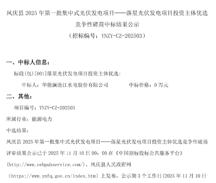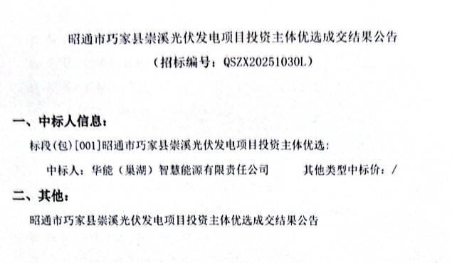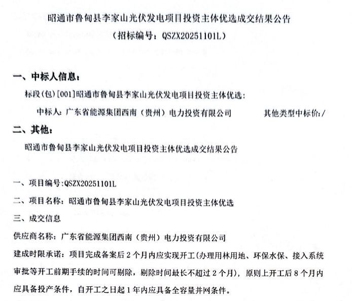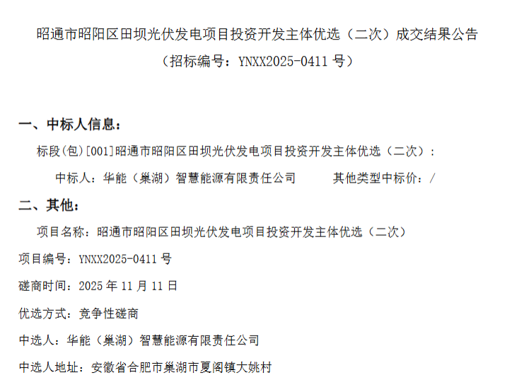 其中,昭通市昭阳区田坝光伏发电项目为二次优选项目,原中选企业为中国电力工程顾问集团西南电力设计院有限公司(含联合体:安徽旭合新能源科技有限公司)。