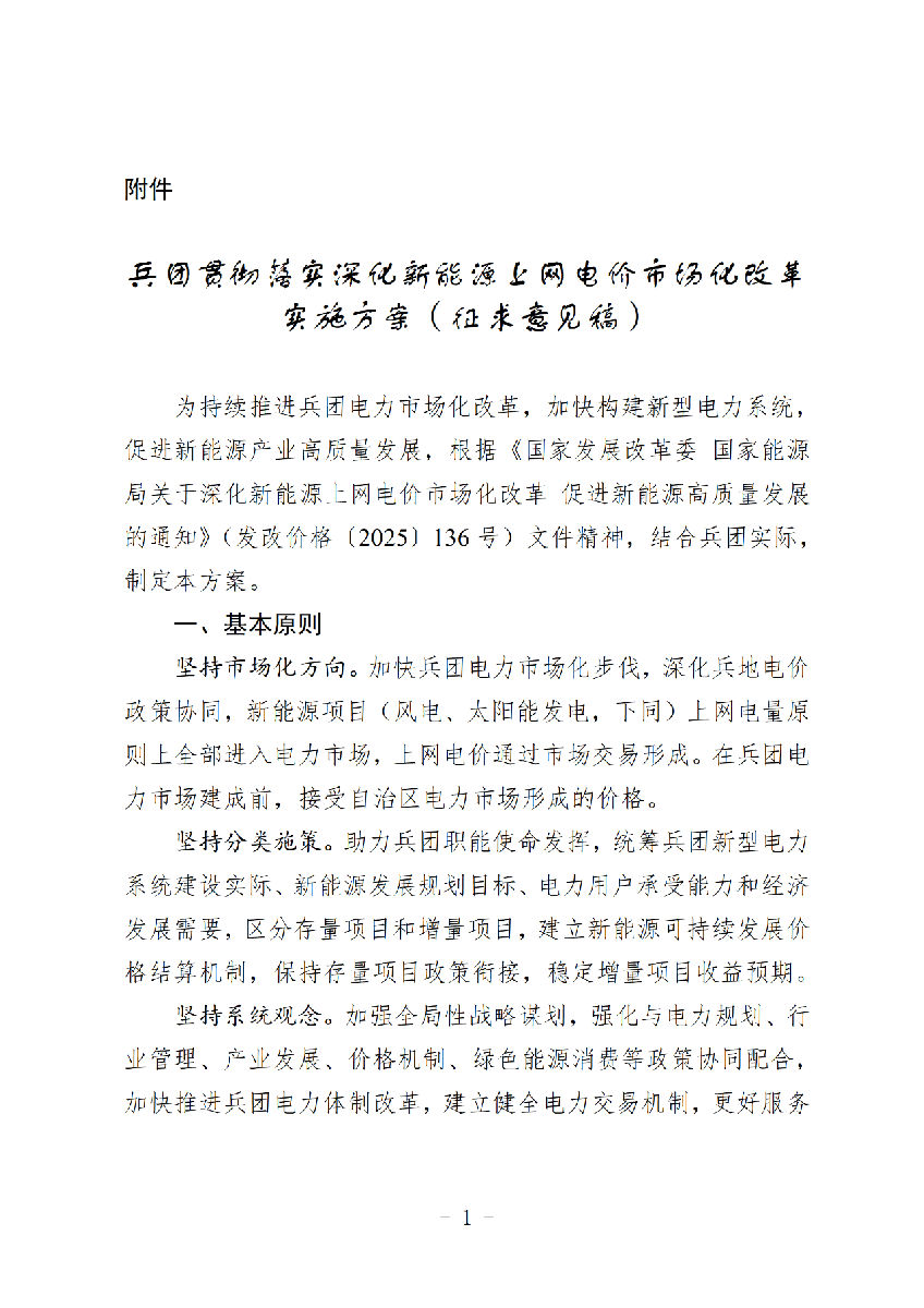 为持续推进兵团电力市场化改革,加快构建新型电力系统,促进新能源产业高质量发展,根据《国家发展改革委 国家能源局关于深化新能源上网电价市场化改革 促进新能源高质量发展的通知》(发改价格〔2025〕136号)要求,我委研究制定了《兵团贯彻落实深化新能源上网电价市场化改革实施方案(征求意见稿)》。现向社会公开征求意见建议,相关单位及社会各界人士可将意见建议通过电话、传真或者邮箱反馈至兵团发展改革委价格处。