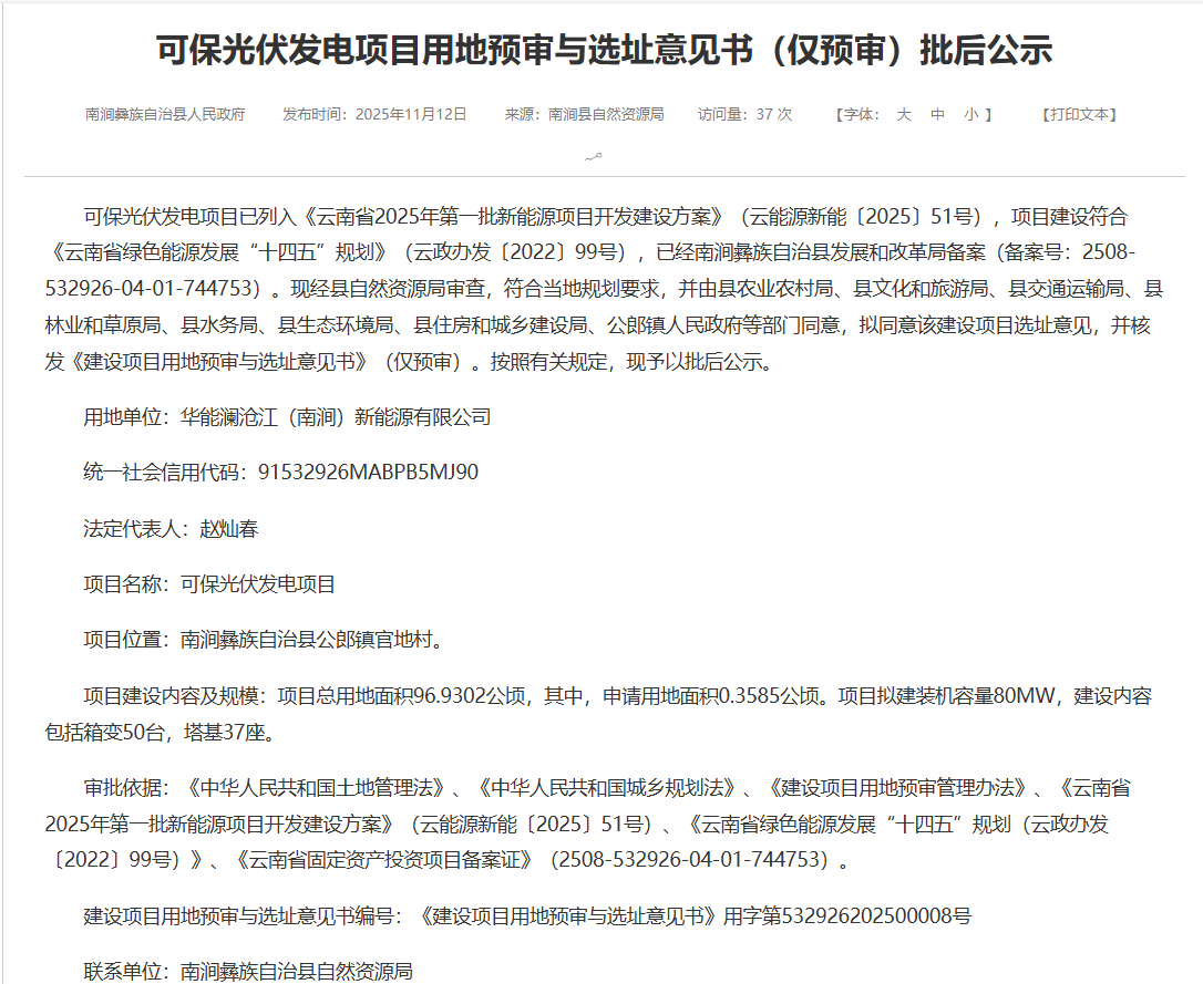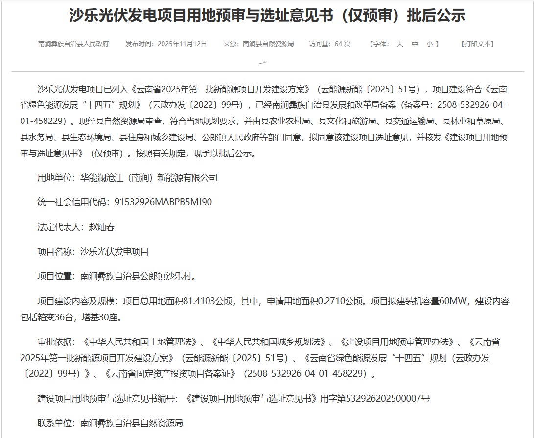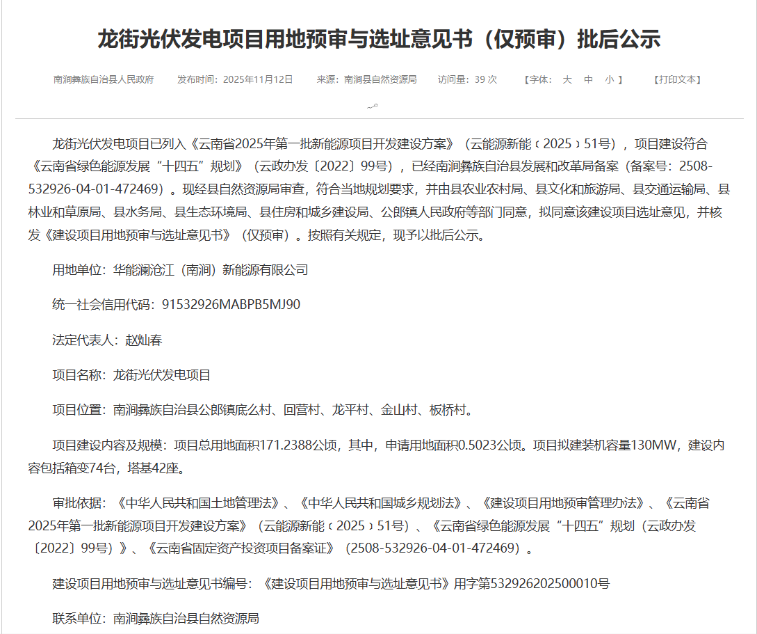 11月12日,云南南涧公示多个光伏项目用地预审与选址意见书,业主均为华能澜沧江,规模总计为490MW,均列入云南省2025年第一批新能源项目开发建设方案。
