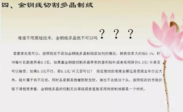 金刚线切割的多晶硅片目前瓶颈主要是制绒后电池转换效率偏低以及硅片表面发亮的问题,这也是后续金刚线大规模应用所必须面对的(目前认为黑硅是解决绒面效果较差的问题和发亮的问题的方法之一。)