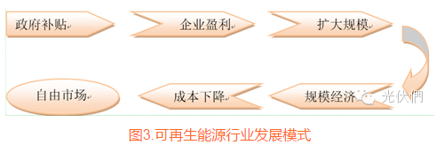 可再生能源行业发展模式如下图所示,就是要逐步从政府补贴扶持过渡到自由市场,因此,伴随行业成本下降适时降低电价补贴本身是合理的,也是符合预期的。此外,政府不会允许依托财政补贴发展的行业收益率过高,必然会将其维持在一个合理水平。实际上2014年初已降过一次电价:截止2013年12月31日并网的光伏项目根据资源区不同电价分别为1.15元/度和1.0元/度,未并网的自2014年1月1日起电价分别为1.0元/度和0.9元/度。