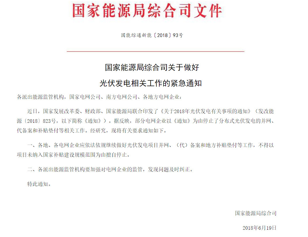 近日,国家发展改革委、财政部、国家能源局联合印发了《关于2018年光伏发电有关事项的通知》(发改能源〔2018〕823号,以下简称《通知》)。据反映,部分电网企业以《通知》为由停止了分布式光伏发电的并网、代备案和补贴垫付等相关工作。经研究,现将有关要求通知如下。