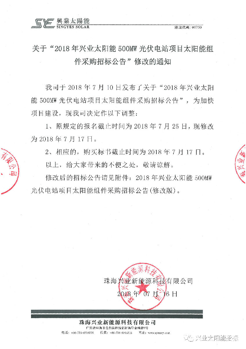 7月16日,珠海兴业新能源科技有限公司发布了《关于“2018年兴业太阳能500MW光伏电站项目太阳能组件采购招标公告”修改的通知》,指出为加快项目建设,将原规定的报名时间2018年7月25日修改为2018年7月17日。