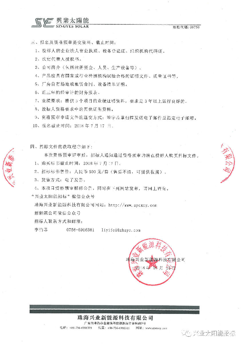 兴业太阳能修改2018年500MW光伏组件招标报名时间,提前至7月17日