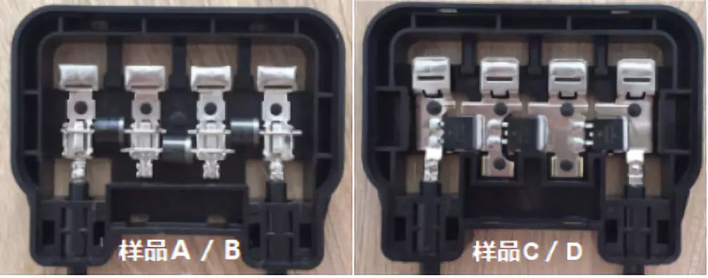 为了观察轴向二极管和平面二极管的散热情况,我们选择了2款轴向二极管的接线盒(A/B),2款贴片二极管的接线盒(C/D)。 4款接线盒(样品A/B/C/D/)的散热方式均是二极管产生的热量先通过导热硅胶和PPO外壳,再和接线盒壳体外空气进行热交换。