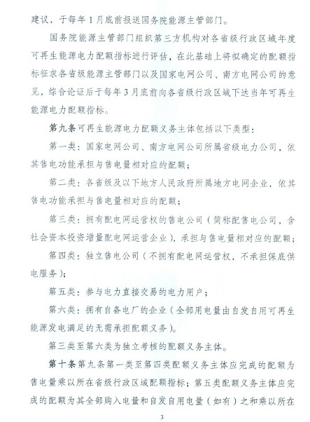 第三条 各类从事售电业务的企业及所有电力消费者共同履行可再生能源电力配额义务。各类售电公司(含电网企业售电部分,以下同)、参与电力直接交易的电力用户和拥有自备电厂的企业接受配额考核。通过对各配额义务主体核算可再生能源电力绿色证书(简称“绿证”)数量考核其配额完成情况。