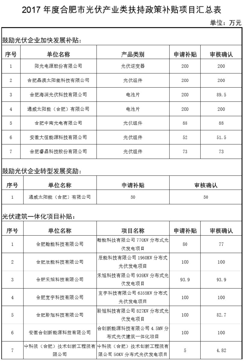 关于2017年度合肥市光伏产业类扶持政策补贴资金兑现的公示